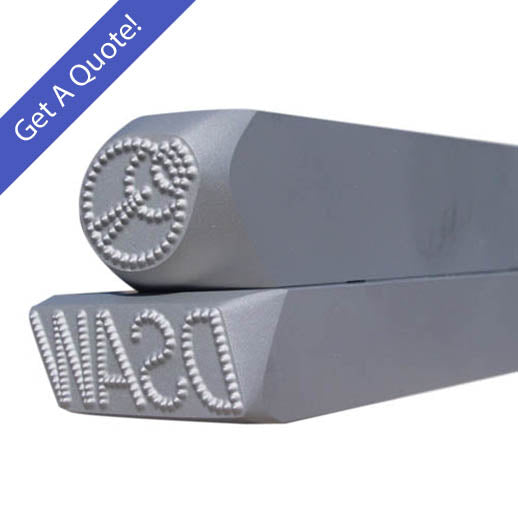 Handheld Stamps for Metal are versatile and ready to use when making permanent marks. With a hammer or mallet, safety goggles, and a bench block, these stamps are handy and convenient for any application. Available with stock or custom-designed artwork, handheld stamps are suitable for stamping steel or other metals.