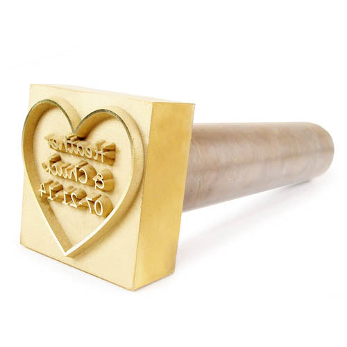 Our custom brass leather stamps are made in-house, right here in the USA. The Custom Leather Stamp can feature virtually any logo, any artwork, whatever you can dream up and are designed to be used in a press or as a hand held stamp by adding the optional steel handle available for most sizes.